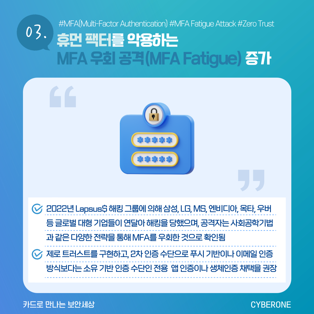 - 2022년 Lapsus$ 해킹 그룹에 의해 삼성, LG, MS, 엔비디아, 옥타, 우버 등 글로벌 대형 기업들이 연달아 해킹을 당했으며, 공격자는 사회공학기법과 같은 다양한 전략을 통해 MFA를 우회한 것으로 확인됨