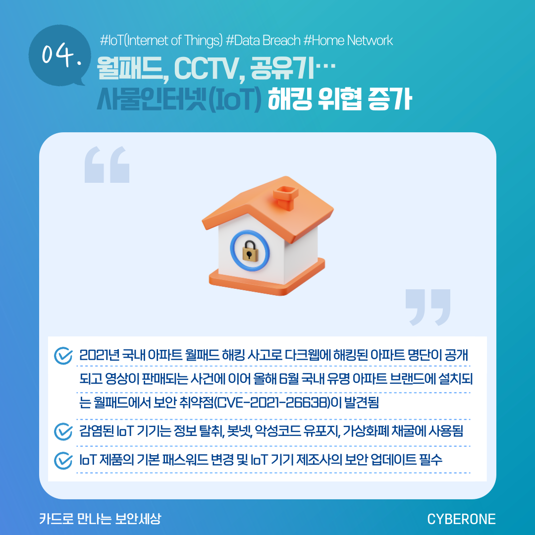 - 2021년 국내 아파트 월패드 해킹 사고로 다크웹에 해킹된 아파트 명단이 공개되고 영상이 판매되는 사건에 이어 올해 6월 국내 유명 아파트 브랜드에 설치되는 월패드에서 보안 취약점(CVE-2021-26638)이 발견됨
