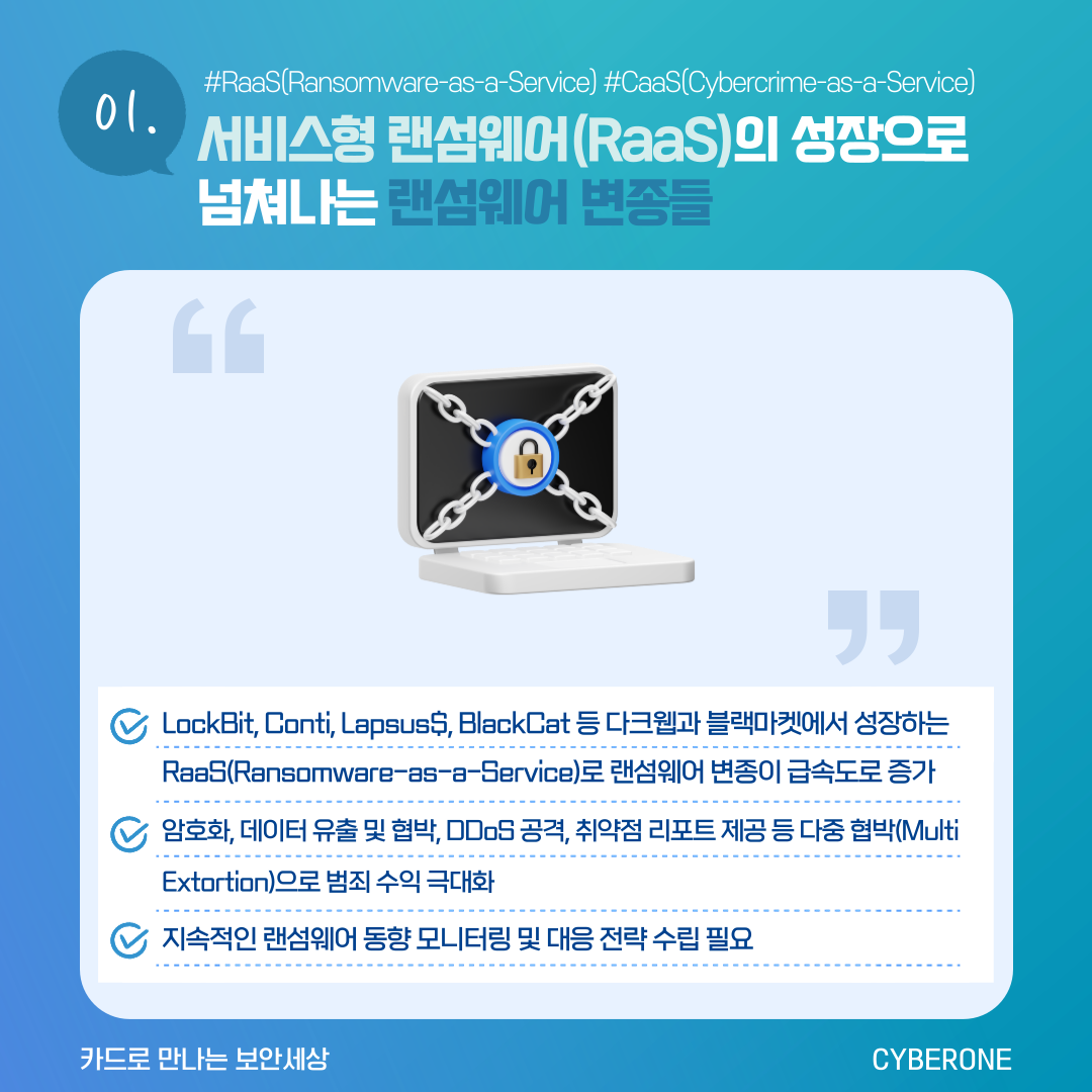 - LockBit, Conti, Lapsus$, BlackCat 등 다크웹과 블랙마켓에서 성장하는 RaaS로 랜섬웨어 변종 급속도로 증가