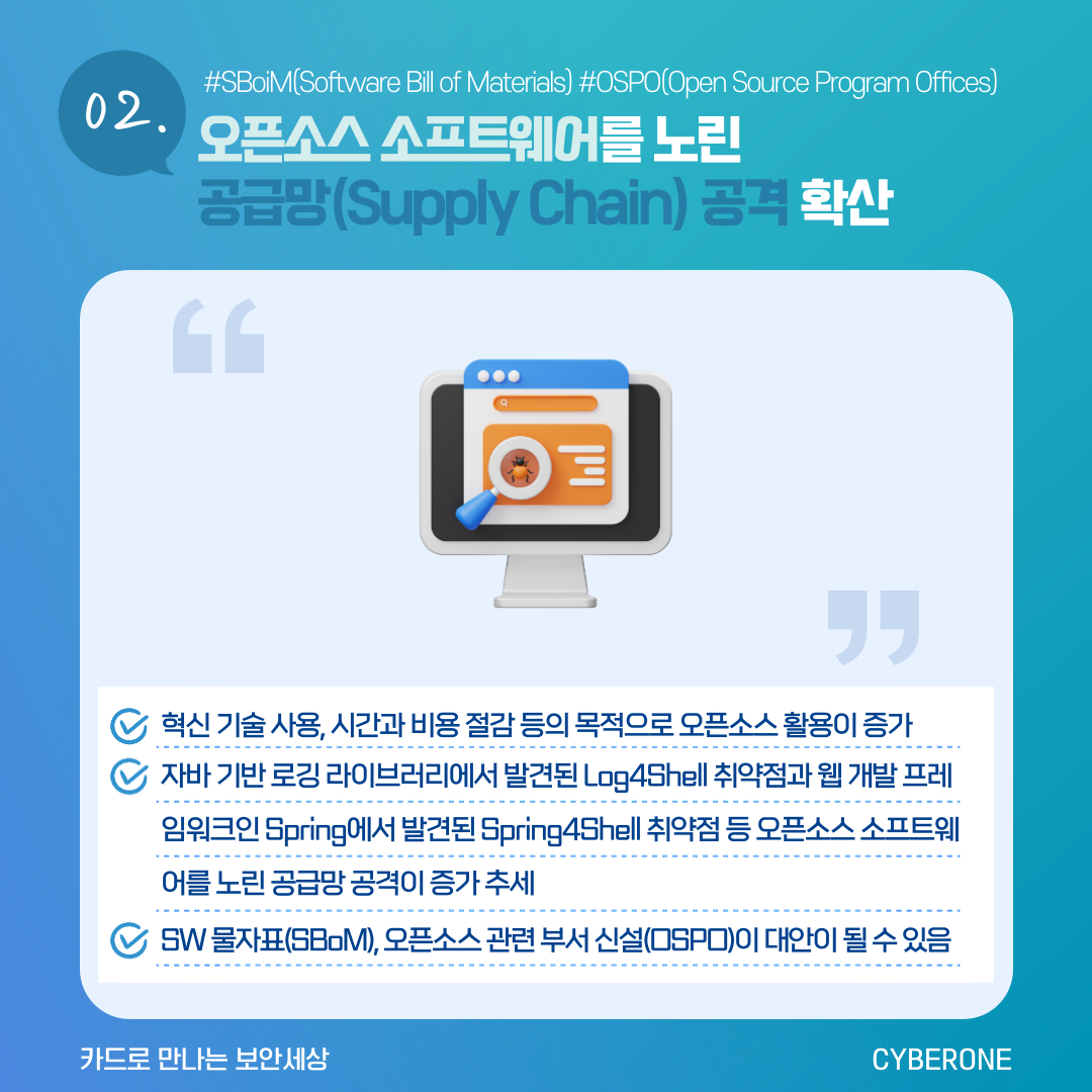 - 자바 기반 로깅 라이브러리에서 발견된 Log4Shell 취약점과 웹 개발 프레임워크인 Spring에서 발견된 Spring4Shell 취약점 등 오픈소스 소프트웨어를 노린 공급망 공격이 증가 추세