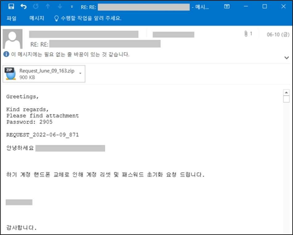 보안 솔루션 탐지를 우회하기 위해 악성 첨부 파일에 비밀번호를 설정해 두고 이를 메일 본문에 기재해 두는 방식의 피싱 사례도 발견된다.