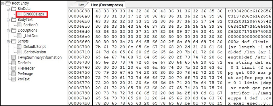 [그림 30]은 한글문서 내 삽입되어 있는 EPS 파일의 포스트스크립트를 확인한 것이다. 특정 변수에 쉘코드가 포함되어 있고, 이를 xor 디코딩하여 실행하는 구조로 동작한다. 취약한 버전을 사용하는 경우 사용자의 추가적인 상호작용없이 문서를 열람하기만해도 쉘코드가 실행되어 악성코드에 감염될 수 있다.