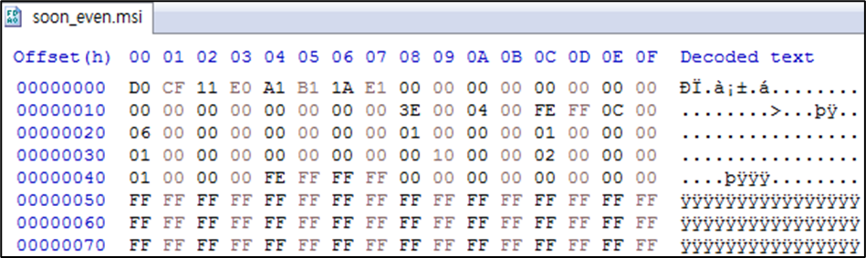 MSI 형태의 인스톨러는 .msi 확장자를 가지며, 파일 시그니처는 구버전 문서 파일(doc, xls 등)과 같은 “D0 CF”로 시작한다. 즉 MSI 파일은 독립적인 실행파일이 아니며, 실행 시 msiexec.exe 프로세스에 의해 실행이 된다.