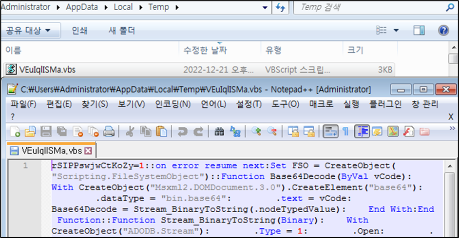 다음은 LNK 파일을 실행하여 %tmp% 경로에 생성된 VBScript 파일(.vbs)을 확인한 것이다.