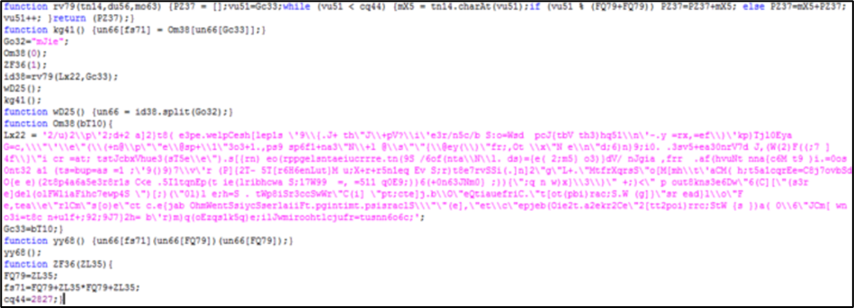 [그림 32]는 JScript 형태로 유포된 소디노키비 랜섬웨어 샘플이다. 해당 스크립트는 탐지 우회 및 분석 방해를 위해 난독화가 적용되어 있다.