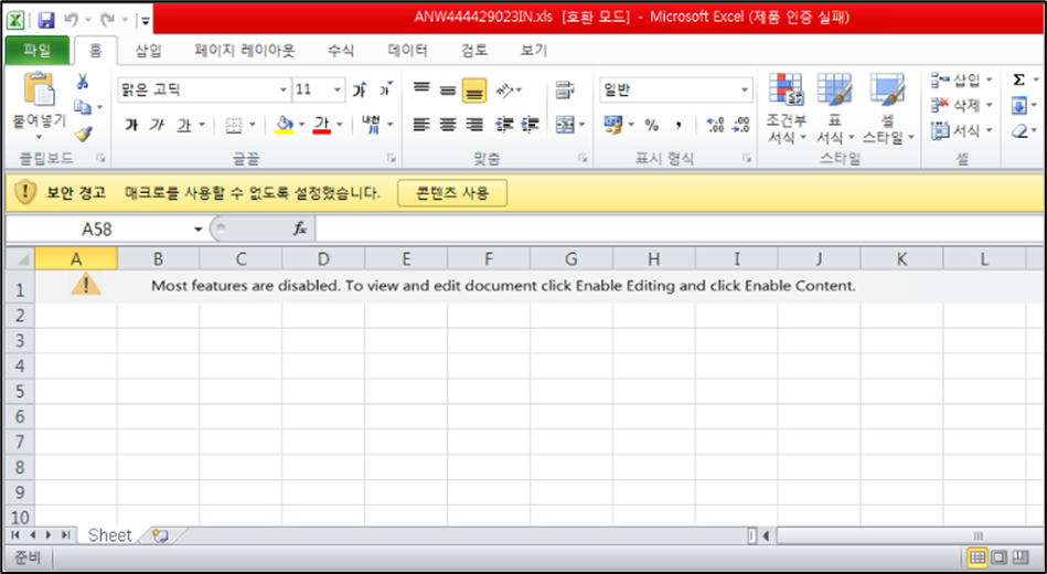 기본적인 보안 설정 상 문서 열람 시 매크로가 자동으로 실행되지 않도록 되어 있으며, [그림 11]에서 보는 바와 같이 사용자가 ‘콘텐츠 사용’ 버튼을 클릭해야 매크로가 실행되는 구조이다.