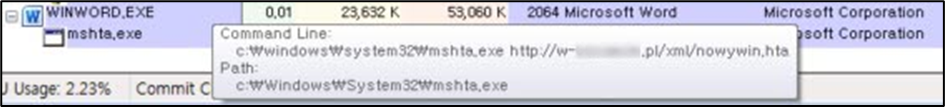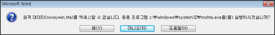 해당 샘플은 DDE 기능을 통해 mshta 프로세스를 실행하여 원격지의 악성코드(nowywin.hta)를 다운로드하도록 제작되었으며, [그림 17]의 대화 상자에서 “예(Y)”를 누르면 mshta 프로세스가 실행되면서 악성코드를 다운로드하게 된다.
