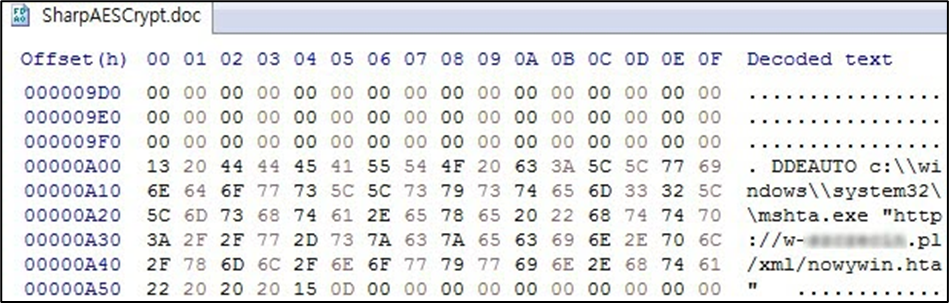DDE 기능이 포함된 문서에서는 DDEAUTO 키워드가 포함된 DDE 필드를 확인할 수 있다. 해당 필드에서 DDE를 통해 실행되는 프로세스와 커맨드 라인을 확인 가능하다.