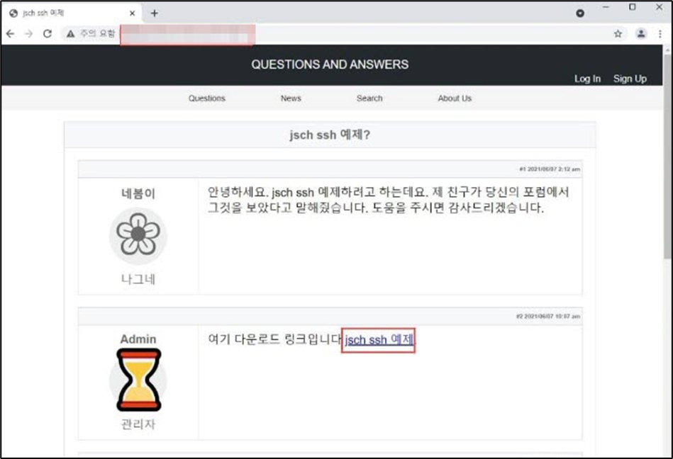 반면, 해커가 직접 피싱 사이트를 구축하는 것 대신 정상적인 웹사이트를 해킹하여 피싱 페이지를 노출시키는 사례도 발견된다. 대표적으로 Revil 랜섬웨어 그룹의 경우, 정상적인 웹사이트를 해킹하여 악성 자바스크립트를 삽입한 뒤, 일반 사용자가 접속 시 가짜 Q&A 포럼 페이지가 오버레이 되도록 조작하였다. 해킹된 사이트를 접속하면 [그림 5]와 같이 악성코드 다운로드 링크가 존재하는 가짜 Q&A 포럼 페이지가 나타난다. 일반적인 사용자들은 자칫 의심없이 링크를 클릭하여 악성코드를 다운로드하여 감염될 위험이 있다.