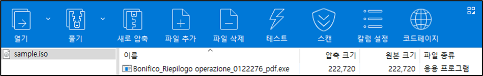 윈도우 8 이전에는 ISO 이미지를 마운트 하기 위해서 별도의 프로그램 설치가 필요하였다. 하지만, 윈도우 8 이상부터는 별도의 프로그램 설치 없이 단지 ISO 이미지 파일을 더블 클릭하는 것만으로도 마운트가 가능하게 되었다. ISO 이미지에 대한 마운트 기능이 기본적으로 제공됨에 따라 공격자들 역시 이를 악성코드 유포에 활용하기 시작했다. [그림 34]는 악성코드를 포함하고 있는 ISO 악성코드 샘플이다. ISO도 기본적으로 아카이브 형태이기 때문에 마운트를 시키지 않고 압축 프로그램을 통해서도 내부 파일을 확인이 가능하다.