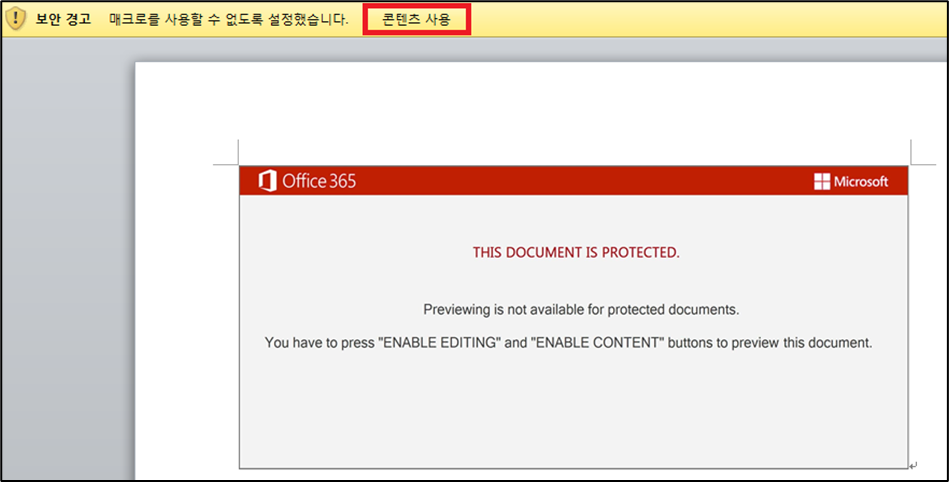 이처럼 매크로가 동작하기 위해서는 사용자의 추가 액션이 필요하기 때문에 매크로가 포함된 악성 문서 파일은 “문서를 보기 위해 '편집 사용' 및 '콘텐츠 사용' 버튼을 누르세요” 와 같은 문구를 표시하여 매크로 실행을 유도하는 경우가 많다.
