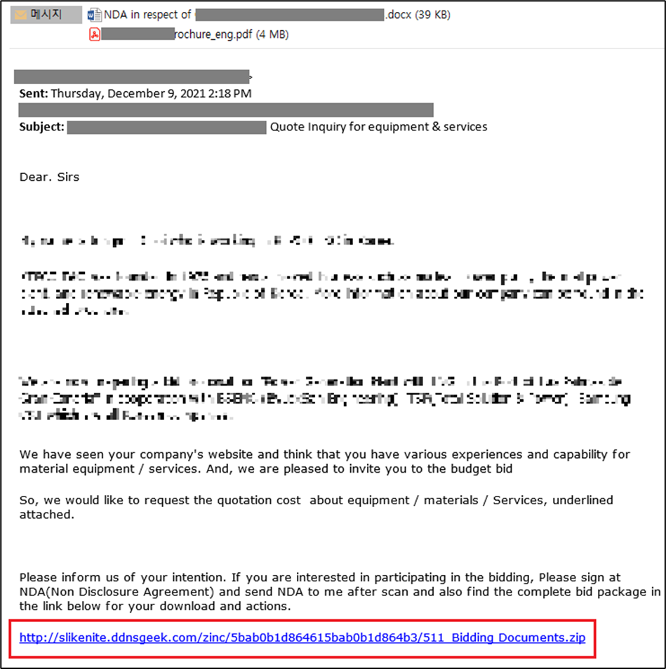 다음은 첨부된 파일은 정상이지만 메일 본문에 악성 다운로드 링크가 포함된 피싱 사례이다.