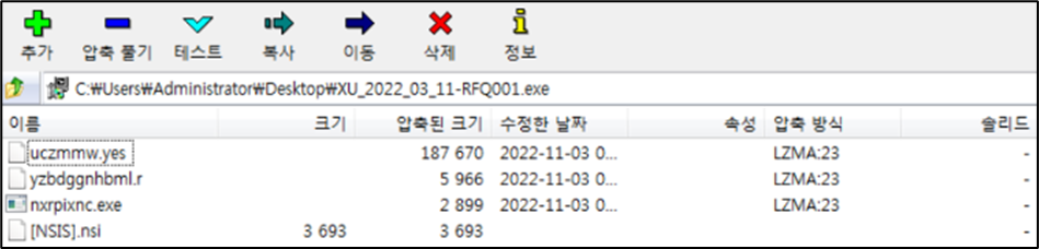 널소프트 인스톨러(NSIS)는 윈도우 EXE 파일과 확장자(.exe) 및 시그니처(“4D 5A”)가 동일하며, 실행 시 내장하고 있는 파일을 특정 경로에 드롭하여 실행하는 방식으로 동작한다.