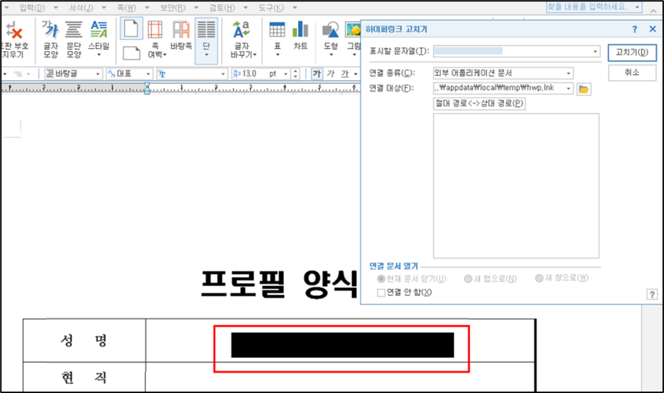본문은 프로필 양식을 기입하도록 유도하고 있으며, 공백을 작성하여 악성 OLE 개체와 연결되도록 하이퍼링크가 설정되어 있다. OLE 개체는 문서 실행 시 %TEMP% 경로에 자동으로 생성이 되기 때문에 하이퍼링크로 연결되는 OLE 개체의 경로는 %TEMP% 경로로 설정된다.