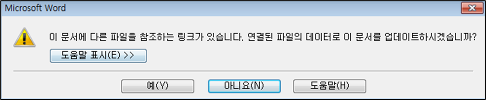 DDE가 적용된 문서를 열람하면 "이 문서에 다른 파일을 참조하는 링크가 있습니다."라는 대화 상자가 나타난다. 대화 상자에서 “예(Y)”를 누르면 [그림 17]과 같은 대화 상자가 추가적으로 나타난다.