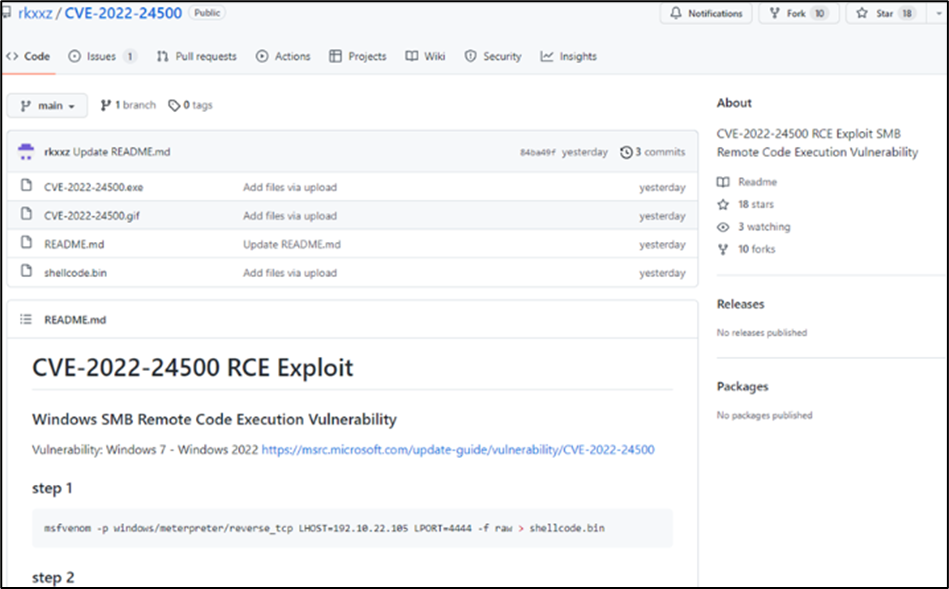 새로운 취약점이 발견되었을 경우, PoC로 가장하여 보안 연구원들을 타겟으로 악성코드를 유포하는 사례가 다수 발견되고 있다. [그림 9]는 올해 공개된 윈도우 SMB 취약점(CVE-2022-24500)의 PoC로 위장한 악성코드가 유포되었던 깃허브 저장소이다. 현재 해당 깃허브 저장소는 삭제된 상태이다.
