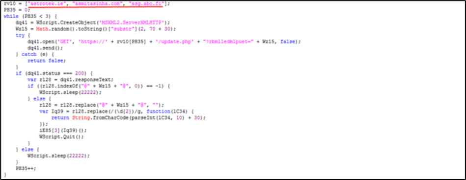 행위 분석을 위해 난독화를 해제한 뒤 소스 코드를 확인해보면, 추가 데이터 수신을 위해 3개의 URL에 접속 시도하는 것을 알 수 있다.