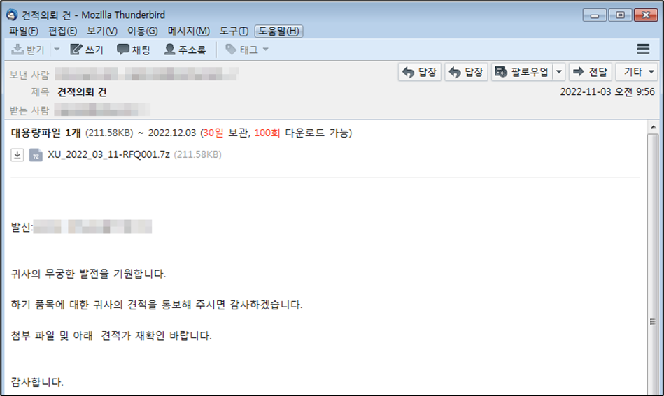 피싱 이메일은 크게 링크가 삽입되어 있는 케이스와 첨부파일이 포함되어 있는 케이스로 구분할 수 있다. [그림 1]은 견적의뢰 건으로 위장하여 악성 첨부 파일 열람을 유도하는 피싱 이메일이다.