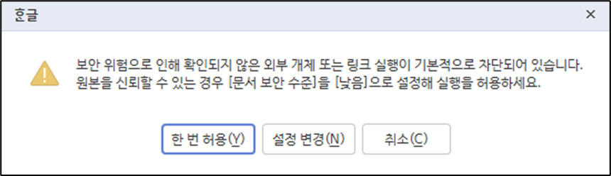 OLE 개체를 직접 클릭하거나 이와 연결된 하이퍼링크를 클릭하면 악성 OLE 개체가 실행된다. 단, 즉시 실행되는 것을 방지하기 위하여 [그림 25]와 같은 보안 경고 메시지가 나타난다. 단, 한글문서의 버전이나 문서 보안 수준 설정에 따라 다를 수 있다.