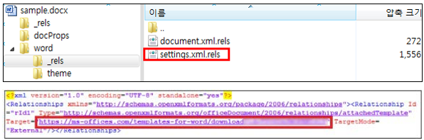 원격 템플릿 기능이 존재하는 악성 문서(.docx)를 압축 해제 시 “/word/_rels/settings.xml.rels” 파일에서 원격 템플릿 다운로드 URL을 확인할 수 있다.