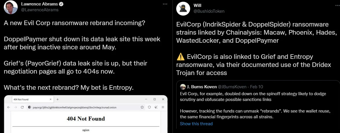 Entropy 랜섬웨어가 DoppelPaymer(브랜드 변경을 통해 Grief 또는 Pay로 불림) 랜섬웨어의 리브랜딩이라는 의혹도 있습니다. DoppelPaymer 랜섬웨어를 대상으로 하는 Sophos 시스템에서 동일한 패커 코드가 감지되었다는 보고서를 통해 해당 의혹에 대한 근거가 힘을 실었습니다.