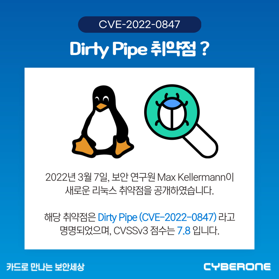 해당 취약점은 Dirty Pipe (CVE-2022-0847) 라고 명명되었으며, CVSSv3 점수는 7.8 입니다.