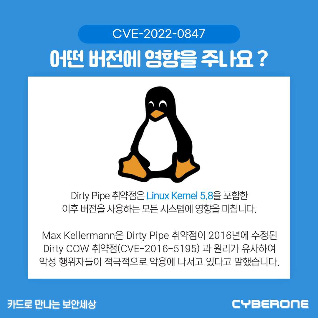 Dirty Pipe 취약점은 Linux Kernel 5.8을 포함한 이후 버전을 사용하는 모든 시스템에 영향을 미칩니다.