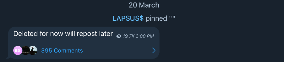 스크린샷을 게시한 직후 Lapsus$ 그룹은 해당 게시물을 삭제하고 "삭제된 내용은 나중에 다시 게시합니다."라는 메시지로 대체했습니다. 그러나 보안 연구원은 스크린샷을 캡처하여 Twitter에 공유했습니다.