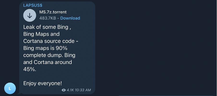 3월 22일, Lapsus$ 그룹은 Microsoft의 Bing, Bing Maps, Cortana 소스코드 데이터를 유출했습니다. Bing Maps은 90% 완전한 덤프이고, Bing과 Cortana는 45%라고 덧붙였습니다.