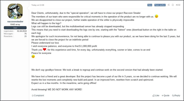 보안 연구원 3xp0rt 가 처음 발견한 것처럼 Racoon Stealer의 배후 공격자는 러시아어를 사용하는 해킹 포럼(XSS)에 핵심 개발자 중 한 명이 우크라이나 침공으로 사망한 후 운영을 중단한다고 게시했습니다.