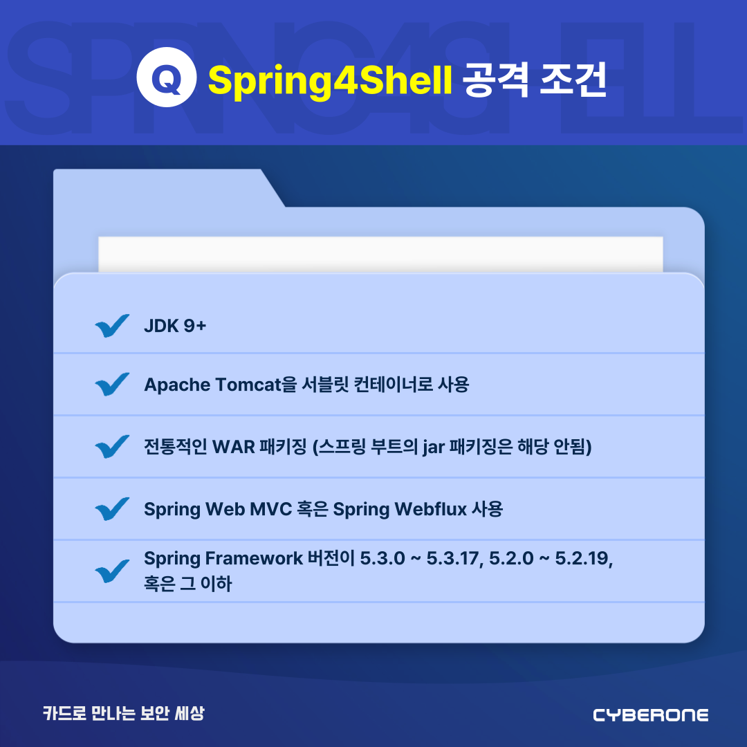 · Spring Framework 버전이 5.3.0 ~ 5.3.17, 5.2.0 ~ 5.2.19, 혹은 그 이하