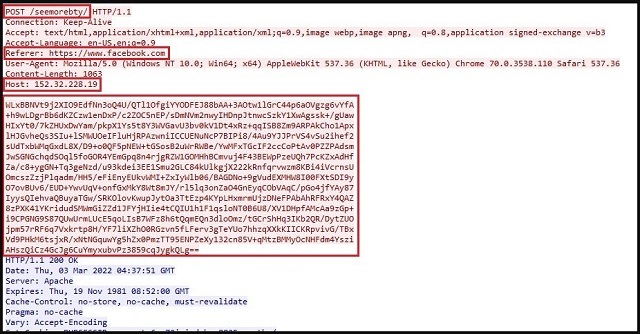 탈취 및 암호 해독을 통해 사용자 이름과 패스워드를 일반 텍스트로 생성한 다음, HTTP POST 요청을 통해 C2 서버로 전송됩니다. 이 캠페인에서 사용된 C2 서버 주소는 http[:]//152[.]32[.]228[.]19/seemorebty였습니다.