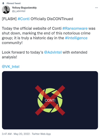 https://www.advintel.io/post/discontinued-the-end-of-conti-s-brand-marks-new-chapter-for-cybercrime-landscapehttps://twitter.com/y_advintel/status/1527360416724094989