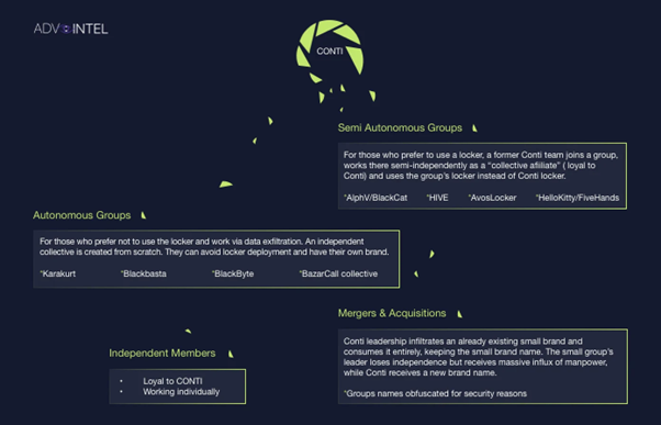 Advanced Intel 보고서는 "Conti 그룹이 HelloKitty, AvosLocker, Hive, BlackCat, BlackByte 등을 포함하여 잘 알려진 랜섬웨어 작업과 파트너 관계를 맺었다"고 설명합니다.