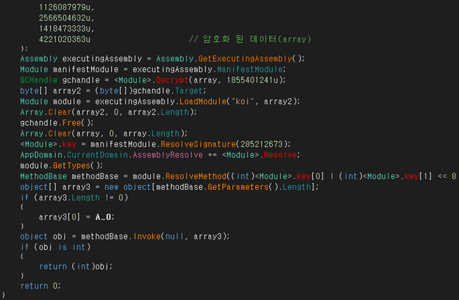해당 샘플은 닷넷으로 개발된 악성코드이며, 닷넷 프로그램의 난독화 도구인 ConfuserEx의 Packer 옵션에 의해 패킹이 되어 있습니다. [그림 2]는 내부 암호화 된 데이터를 복호화하여 ‘koi’ 라는 이름의 모듈로 메모리에 로드 후 실행하는 루틴입니다.