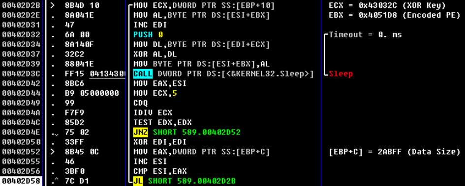 본 샘플은 내부에 DLL 형태의 PE를 인코딩하여 내장하고 있으며, 실행 시 XOR 연산을 통해 디코딩 후 이를 메모리에 로드하여 실행합니다. [그림 3]은 내장된 PE를 디코딩하는 루틴입니다. XOR Key는 초기 1Byte에 33(h), 이후 33 46 30 44 00 (h)이 Key 값으로 사용됩니다.