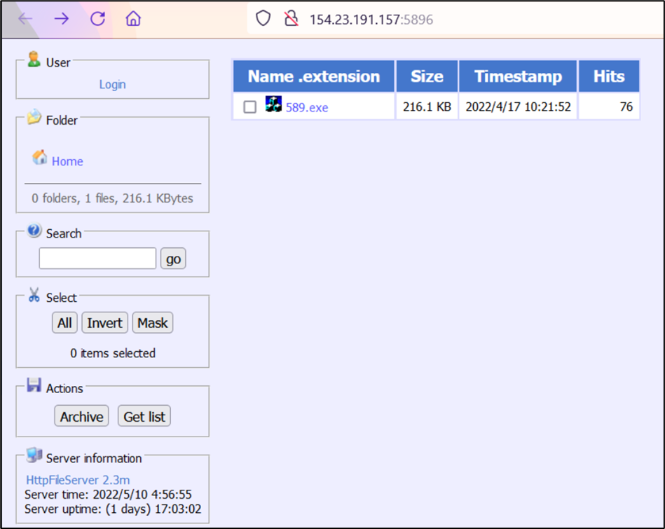 [그림 1]에서 확인된 IP(154.23.191[.]157:5896)에 접속해보면 패킷에서 확인되는 파일은 확인할 수 없었지만, 또 다른 악성코드가 호스팅 되어 있는 것을 발견할 수 있었습니다.
