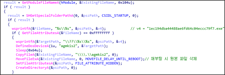 다음은 시작프로그램으로 등록하여 지속성을 확보하도록 설정되었을 경우에 동작하는 루틴입니다. 시작프로그램 경로를 알아온 뒤, 해당 경로로 원본 파일을 복사하고, 재부팅 시 원본 파일을 삭제합니다. 복사 시 파일명은 샘플 내 하드코딩 되어 존재하며, 아래와 같습니다.