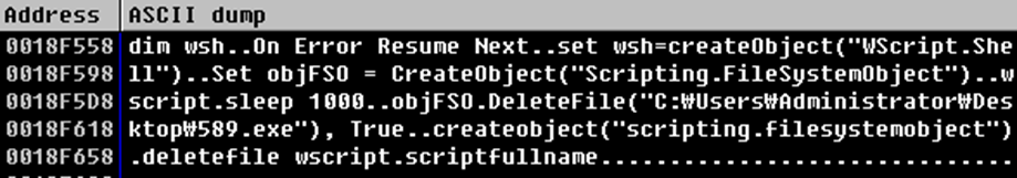 서비스 등록이 완료되면, 현재 실행중인 악성코드가 위치한 드라이브의 루트 경로에 원본 파일 삭제를 위한 vbs파일을 생성하여 실행합니다. 생성되는 파일명 포맷은 [1-9]{1,}.vbs 입니다. (랜덤한 숫자.vbs)