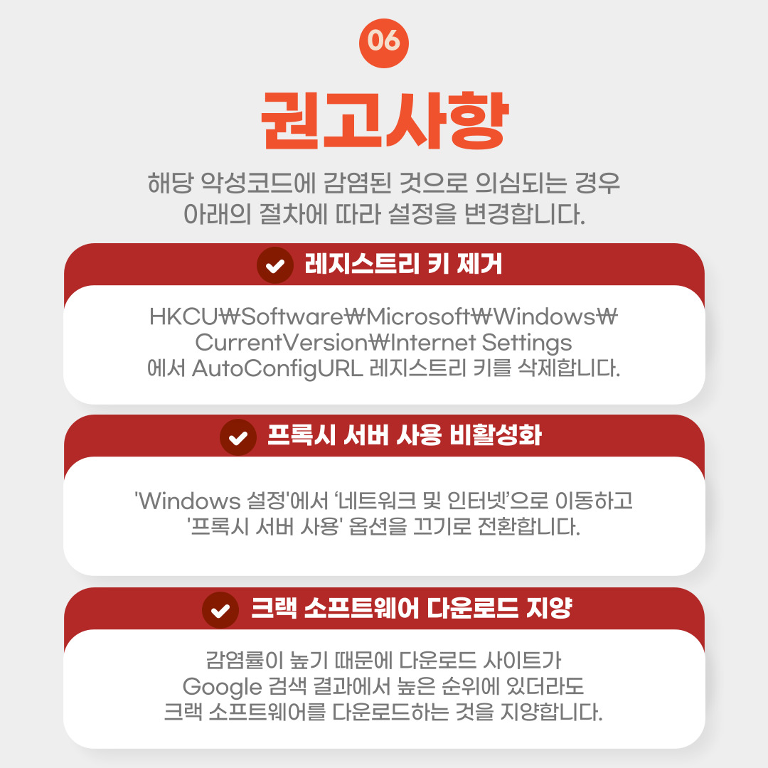 해당 악성코드에 감염된 것으로 의심되는 경우 아래의 절차에 따라 설정을 변경합니다.