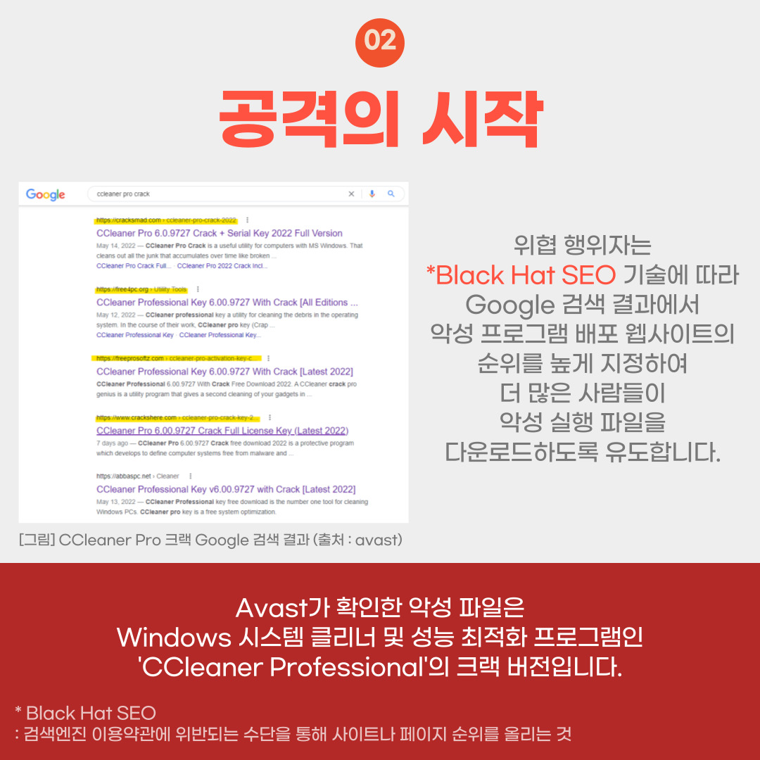 위협 행위자는 *Black Hat SEO 기술에 따라 Google 검색 결과에서