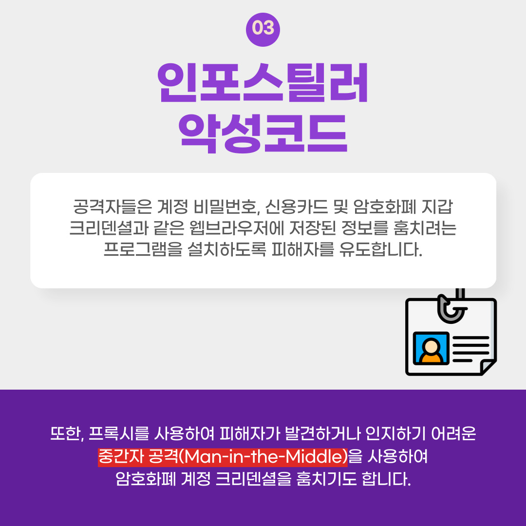 중간자 공격(Man-in-the-Middle)을 사용하여 암호화폐 계정 크리덴셜을 훔치기도 합니다.
