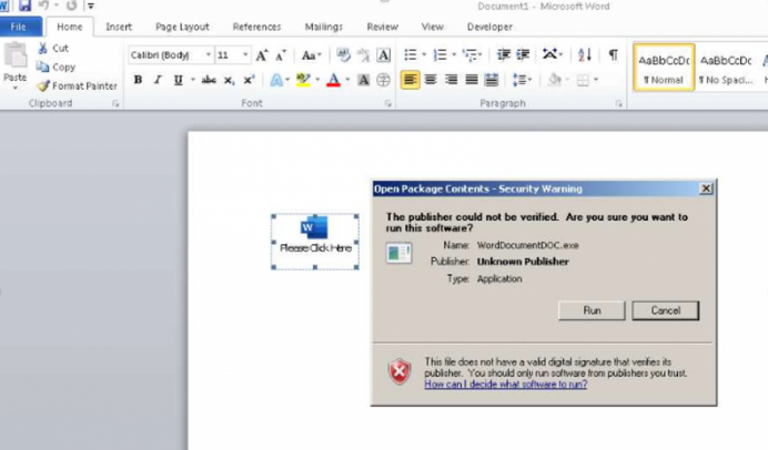 AstroLocker 공격에 사용된 문서를 열면 보안 경고 대화 상자가 표시되고, 피해자가 실행을 클릭하면 랜섬웨어 페이로드가 있는 OLE 개체가 실행됩니다.