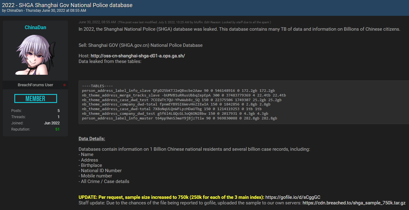 2022년 6월 30일, '차이나댄(ChinaDan)'이라는 필명을 사용하는 해커가 온라인 사이버범죄 포럼 ‘브리치드(breached)’에 ‘2022년 상하이 경찰(SHGA) 데이터베이스가 유출됐다”는 제목으로 게시물을 올렸습니다.