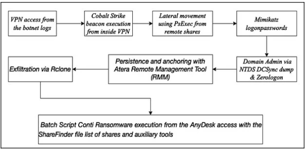 Conti 운영자들은 Mimikatz를 활용하여 DSSync와 Zerologon 공격을 수행하였고, 이 공격을 통해 코스타리카의 상호 연결된 네트워크의 모든 호스트에 엑세스할 수 있었습니다. 또한, 담당자가 Cobalt Strike Beacon을 탐지하는 경우에도 엑세스 권한을 잃지 않도록 하기 위해 관리자 권한이 있는 사용자 중 활동이 적은 호스트를 식별하여 Atera 원격 엑세스 도구를 설치했습니다.