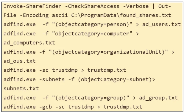공격자는 로컬 네트워크 도메인 관리자의 엑세스 권한을 얻은 후 Nltest 명령줄 도구를 사용하여 도메인 트러스트 관계를 확인했습니다. 이 후 ShareFinder 및 AdFind 유틸리티를 사용하여 네트워크에서 파일 공유를 검색했습니다.