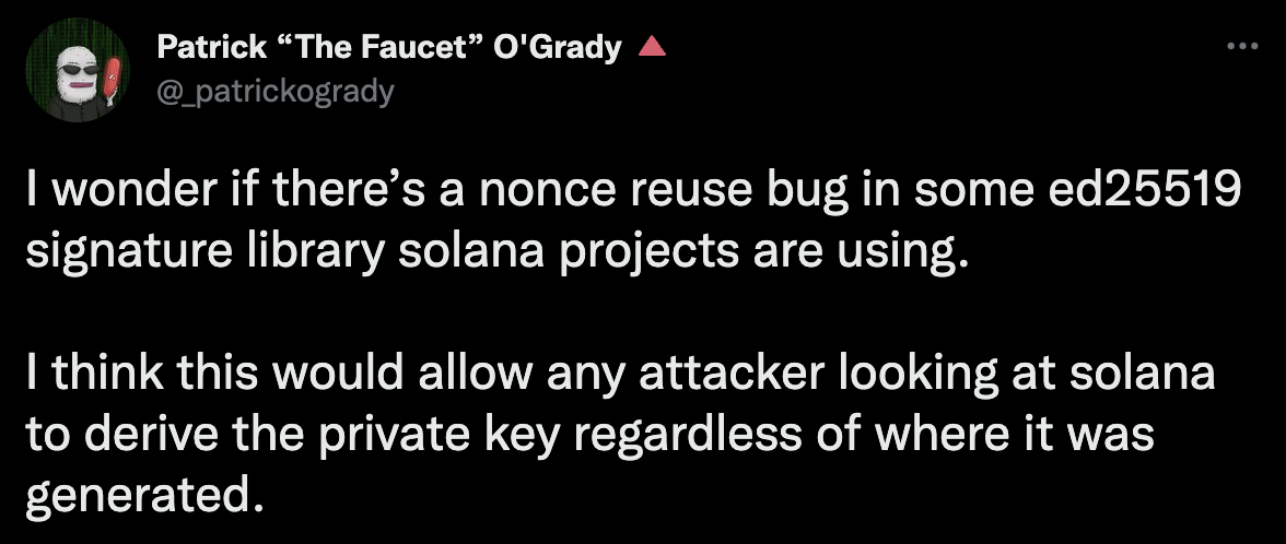 다양한 블록체인 보안 전문가에 따르면 솔라나의 많은 개인 키에 접근하기 위해 사용되는 방법으로 공급망 공격, 브라우저 제로데이 취약점, 키 생성 프로세스에 사용되는 난수 생성기 버그 등이 제시되었습니다.