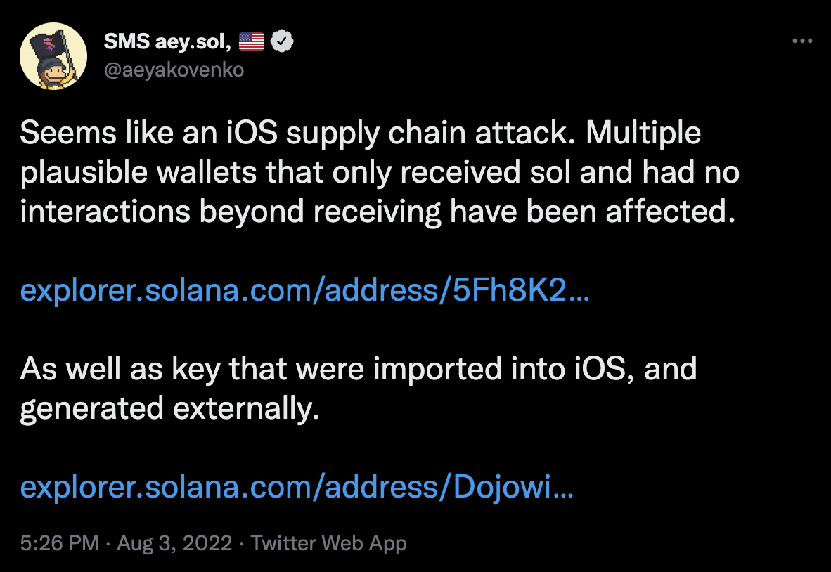 Solana Labs의 CEO인 Anatoly Yakovenko는 처음에 이 익스플로잇이 Apple iOS 공급망 문제와 연결될 수 있다고 의심하는 트윗을 올렸지만, 이후 개인키가 일반 텍스트로 저장되었을 가능성이 있다며 Slope의 중앙 집중 서버 해킹으로 원인을 좁혔습니다.
